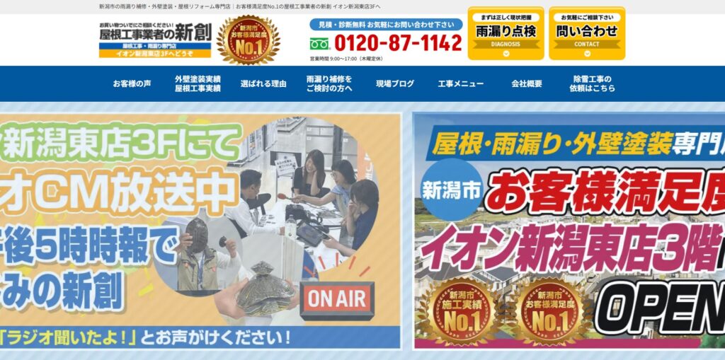 新潟市で雨漏り補修・屋根リフォーム・外壁塗装を手がける専門店。GoogleやYahoo!で500件以上の口コミを獲得し、お客様満足度No.1を実現。BSNラジオの時報スポンサーとして地域に密着し、見積・診断無料で丁寧な現地調査を実施。イオン新潟東店3Fにショールームを構え、予算内で安心できる施工を提供している。