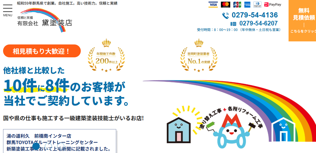 創業昭和59年、群馬県吉岡町を拠点に自社施工体制を整え、地元で信頼の施工を続ける塗装専門業者。外壁・屋根塗装をはじめ、足場からリフォームまで一貫対応し、経験豊かな一級塗装技能士による無料診断・見積もりや最長10年の保証が好評。関東エリアまで柔軟に対応し、適正価格かつ責任ある責任施工で、品質と安心を両