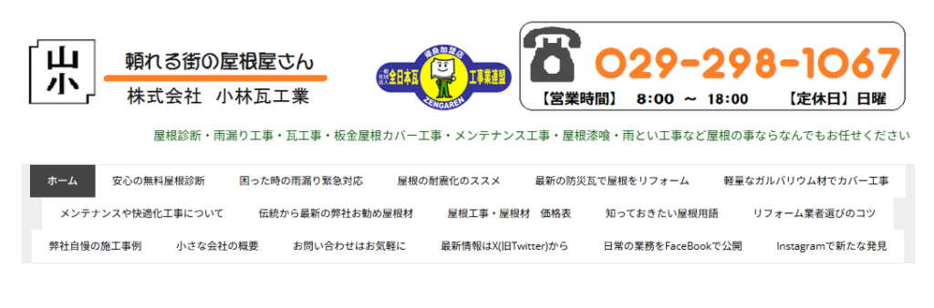 株式会社小林瓦工業は、創業100年以上を誇る老舗の屋根専門工事業者です。瓦から板金屋根、ガルバリウムなどの金属屋根へ対応し、耐震・葺き替え・カバー工法・漆喰工事・雨樋清掃など多彩なメンテナンスを実施。国家資格の屋根診断士を複数名有し、無料での屋根診断・雨漏り緊急対応を常時提供しています。地域密着型の