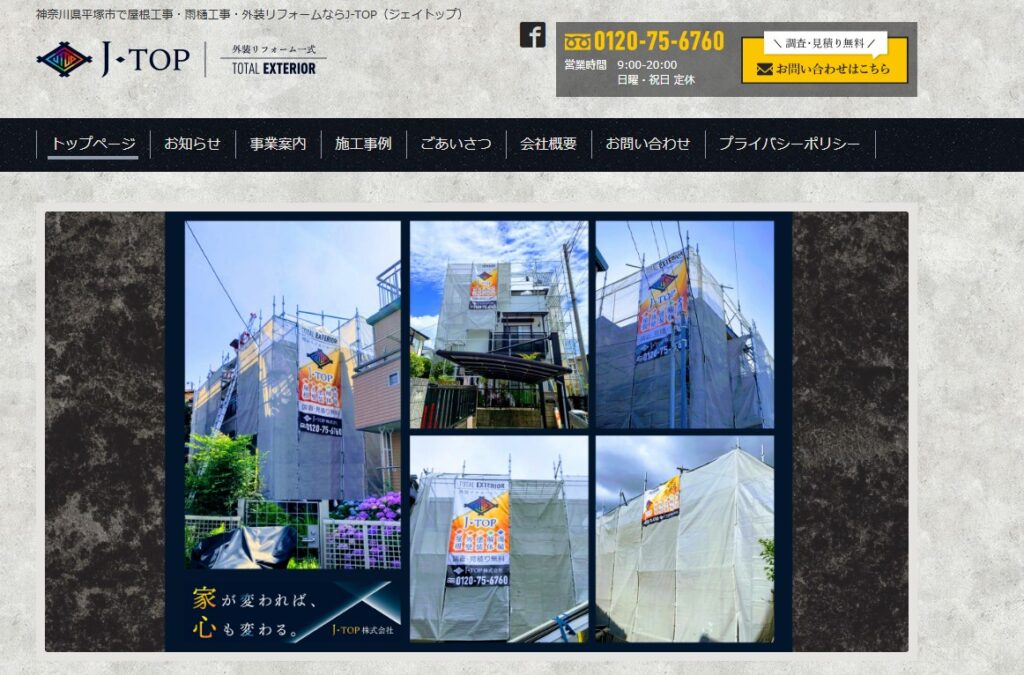 J-TOP株式会社は、神奈川県平塚市に拠点を置く、屋根工事・雨樋工事・外装リフォームを専門とする会社です。主な事業内容には、屋根の葺き替え、カバー工法、板金工事、雨樋の補修、外壁の張り替え・塗り替え・カバー工法など、多岐にわたる外装リフォームが含まれます。お客様のニーズに応じて、最適な施工方法を提案
