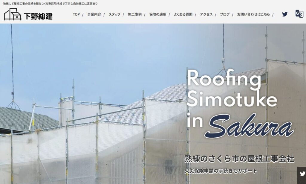 さくら市を拠点とする地域密着の屋根工事専門店で、屋根・雨どい・葺き替え・カーポート・外壁塗装などのリフォーム施工を全て自社スタッフで対応するトータル施工体制を整えています。自然災害調査士の資格を持つスタッフが在籍し、火災保険申請の手続きサポートも行っており、さくら市・矢板市を中心に宇都宮市や栃木県内
